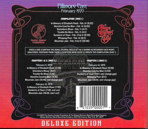 Bear's Sonic Journals: Allman Brothers Band, Fillmore East February 1970 is a completely newly transferred and mastered presentation of live music from The Allman Brothers Band's 3 shows at the Fillmore East on February 11, 13 & 14, 1970. The Grateful Dead' legendary soundman, Owsley Stanley a/k/a Bear, captured these shows on his "Sonic Journals" -his working diary recordings that are known for their uncanny ability to recreate the sonic landscape of the venue, placing the listener's ears in the audience at the show. This is essential listening for Allman Brothers Band fans, as it showcases an early incarnation of the band, with Duane Allman in full form, and features the earliest known live concert recording of "In Memory of Elizabeth Reed, " just penned by Dickey Betts scant weeks before these shows. The band recorded their landmark "At Fillmore East" album a year later at the same venue.