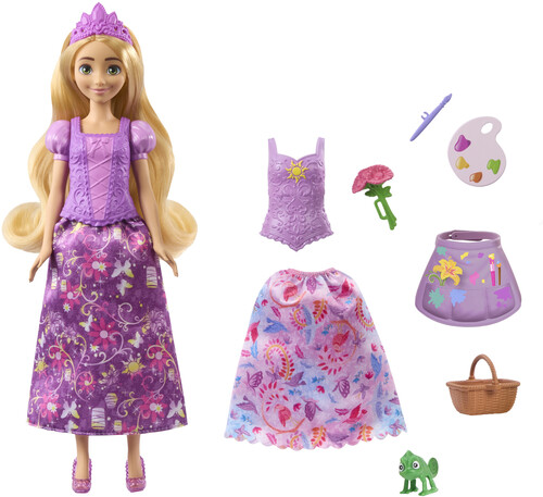 Posable Rapunzel doll features two distinct looksgoing on a picnic or spending a day making artand include two easy-to-use, snap-on bodices; two soft skirts; and nine themed accessories.