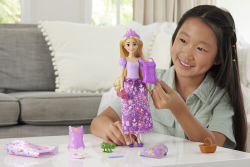 - Disney Princess 2-in-1 Stories Rapunzel fashion doll set has themed fashions and accessories for kids to play out two unique stories!