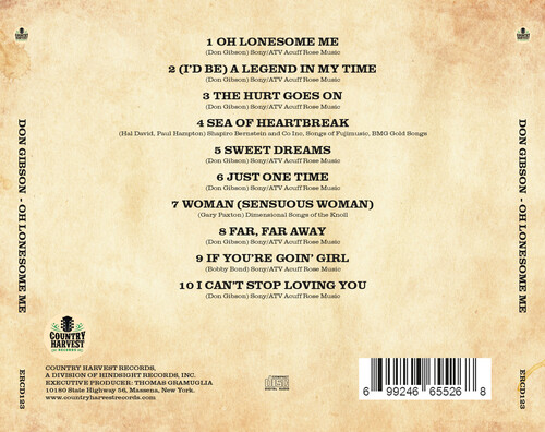 Country Harvest Records pays homage to the iconic Don Gibson with the reissue of "Oh Lonesome Me." A pioneer in the Nashville Sound, Gibson's influence on country music is immeasurable. This classic album features Gibson's signature hit and showcases his distinctive blend of honky-tonk and heartfelt ballads and Country Harvest Records' remastering elevates the timeless quality of Gibson's performances, inviting listeners to immerse themselves in the emotional depth and musicality that define this classic album.