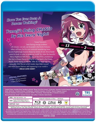 Yumeji Fujiwara’s been having strange problems with dreams: not only can he predict what kind of dreams others will have, but his own nocturnal meanderings have become frighteningly bizarre chases by armies of cats whose leader wants his body in order to access our world! So, when the beautiful Merry Nightmare falls from the sky on top of him, proclaiming that she's a Dream Demon looking for a way back to the Dream World, Yumeji agrees to help her. After all, he needs help too, especially when the cat army’s master stops kitten around and more Dream Demons start appearing in our world in DREAM EATER MERRY!