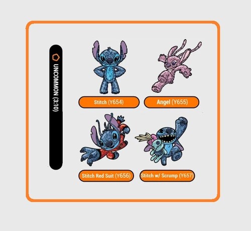 - Uncommon: Stitch (Y654), Angel (Y655), Stitch - Suit (Y656), Stitch & Scrump (Y657)