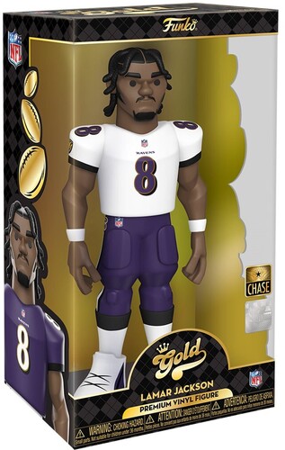 This NFL Ravens Lamar Jackson 12-Inch Vinyl Gold Figure measures approximately 12-inches tall. Comes packaged in a window display box.