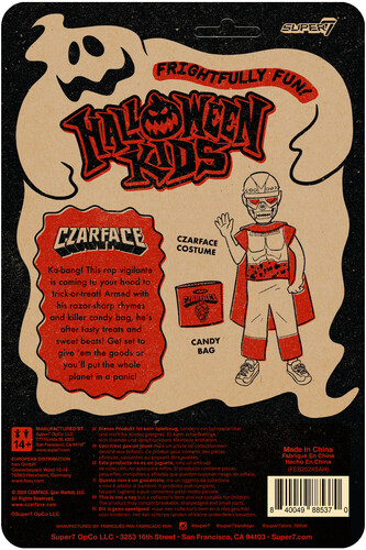 This 3.75” scale, articulated Czarface Boy Halloween Kid ReAction Figure features a young trick-or-treater outfitted in a costume inspired by the legendary hip hop artist and the vintage Halloween costumes from the ‘70s and ‘80s, and includes a candy bag accessory.