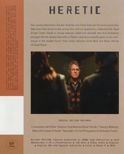Two young missionaries (Sophie Thatcher and Chloe East) are forced to prove their faith when they knock on the wrong door and are greeted by a diabolical Mr. Reed (Hugh Grant). Made to choose between belief and disbelief, they find themselves plunged into the darkest labyrinths of Reed's mind and a deadly game of cat-and-mouse in this twisted horror from writer-directors Scott Beck and Bryan Woods (A Quiet Place).