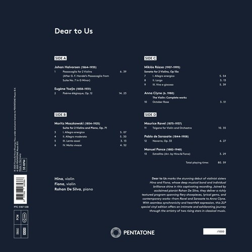 From the fiery virtuosity of Ravel's Tzigane and Sarasate's Navarra to the tender warmth of Ponce's Estrellita, Dear to Us is a compelling journey through technical brilliance and heartfelt expression. The sisters' extraordinary synchronicity, paired with their distinctive voices, creates a musical experience both intimate and exhilarating.