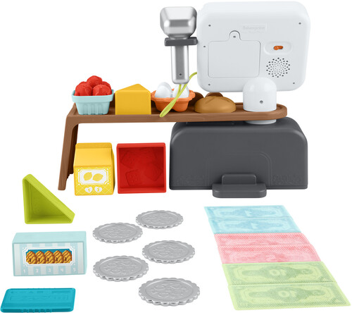 - Pretend cash register and grocery store play set with over 150 songs, sounds and phrases for interactive shopping role play
