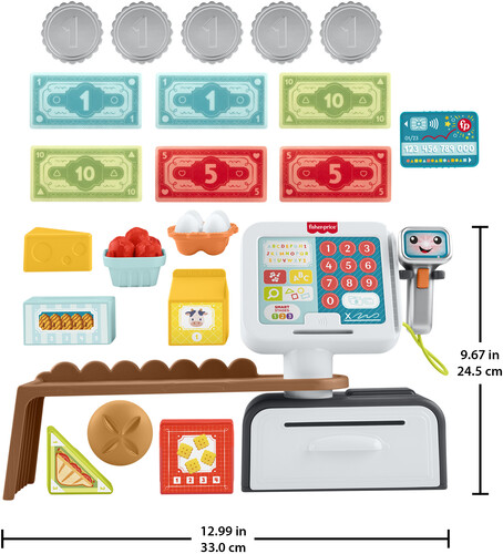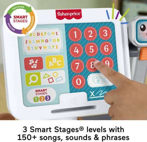 Kiddos can press the 15 buttons on the register or use the scanner to hear 150+ songs, sounds and phrases. This interactive play store includes 20 play pieces and 3 Smart Stages learning levels to enhance storytelling and pretend play as kids shop, checkout and pay.