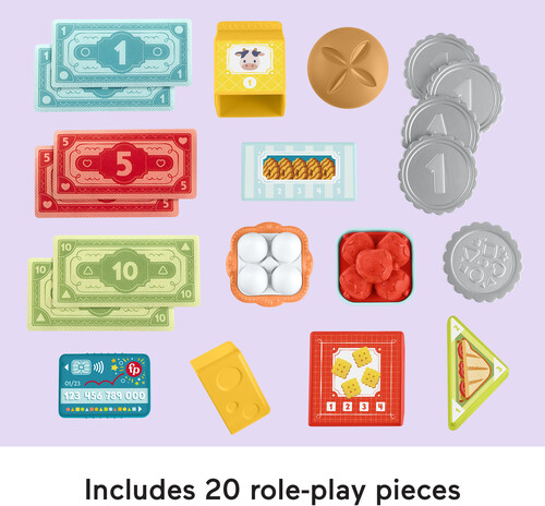 - 20 play pieces, including bread, cheese, eggs, strawberries, box of crackers, box of cookies, sandwich, carton of milk/juice, 11 pieces of money, 1 credit card