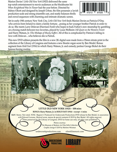 Set in early-19th century New York City, "Little Old New York" (1923) finds Marion Davies as Patricia O'Day, who arrives from Ireland to claim a family fortune... posing as her younger brother Patrick in order to do so. She meets Larry Delavan (Harrison Ford) who had planned on receiving that inheritance so he could back Fulton's new steamship and is now stuck. All of this is complicated by Patricia's falling in love with Delavan... who believes she is Patrick. Marion Davies' "Little Old New York" delivered the same top-notch entertainment to movie audiences as the blockbuster hit "When Knighthood Was In Flower" had the year before. Packed with humor, charm, thrills and crowd scenes, the film possesses a lavish production scale and strong ensemble cast, that includes Louis Wolheim and Harry Watson, Jr. This DVD edition presents the film in a new 2K digital scan made from a 35mm nitrate print in the collection of the Library of Congress and features a new theatre organ score by Ben Model. Bonus: segment from "Hold Fast" (1916) in which Harry Watson, Jr. And comedy partner George Bickel do their famous boxing routine.