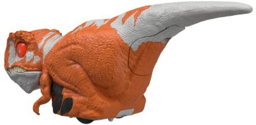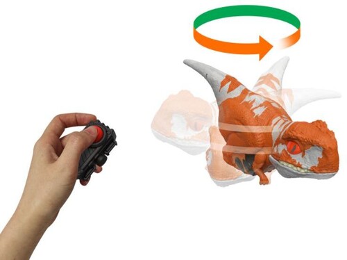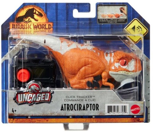 - About 6 in long, this Uncaged Click Tracker Atrociraptor red dinosaur comes with a clicker control that makes it spin, move and make sounds. Watch out, it's still wild and unpredictable!