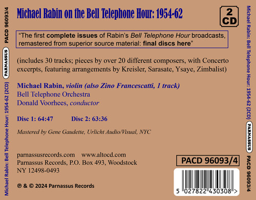 Rabin made frequent appearances on the radio, in particular on a staple of American radio, "The Bell Telephone Hour". In the final part of this series Parnassus Records completes it's series featuring Michael Rabin's performances on The Bell Telephone House, remastered from superior source material.