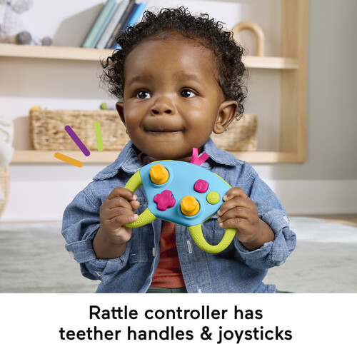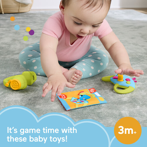 Baby can join in family game night with this set of gaming-themed newborn toys from Fisher-Price.