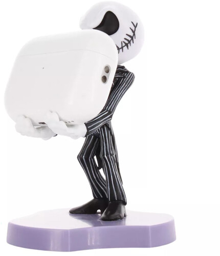 This collectible mini figure is meticulously crafted to securely cradle your phone or earbuds, infusing a touch of personality into your tech setup. With its iconic Jack Skellington design, this Holdem effortlessly combines functionality with visual appeal, promising to elevate your setup with a dash of Halloween magic. Perfect for keeping your earbuds, phone, and other small gadgets organized. Officially licensed by Disney, styled on Jack Skellington from The Nightmare Before Christmas franchise. Approx 4" tall. A great gift for all those gadget lovers. Ear buds not included.