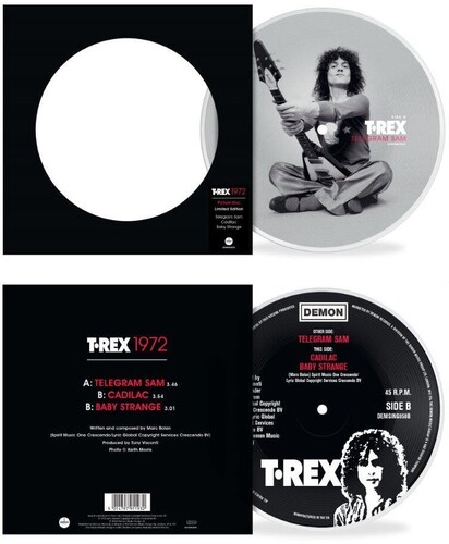Following the success of Demon Records' highly-collectable 7" picture disc releases of T. Rex's 1973 singles, we now turn to the 1972 singles, again featuring photos from the Keith Morris archive. • The second release is the absolute classic "Telegram Sam", originally released in January 1972, effectively a preview of the forthcoming album "The Slider", and these days amongst Marc Bolan's best remembered songs. It was the band's third UK number 1, where it stayed for two weeks (spending fourteen weeks in the charts in total). It knocked The New Seekers' "I'd Like To Teach The World To Sing" off the top spot, and was itself replaced by Chicory Tip's "Son Of My Father", producer Giorgio Moroder's first UK hit. • The song was covered by Bauhaus in 1980. • The first of the B-sides, "Cadilac" (always spelt this way), did not appear on "The Slider" album, released in July 1972.