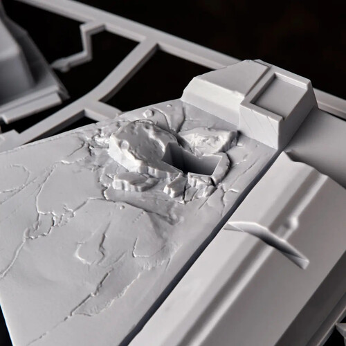 The original resin kit was created in 1997. All parts were 3D scanned and digitally transcribed for this kit. The shape of the wings was also fine-tuned from the original prototype. The angle of attachment and the undulating shape create a sculpture that changes its appearance from various angles, 360 degrees apart. Additionally, the rubble at the base has been increased in size to provide sturdy support for the top-heavy shape, and further detail has been added.