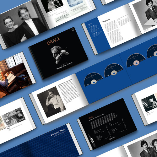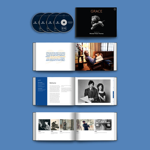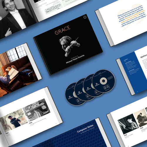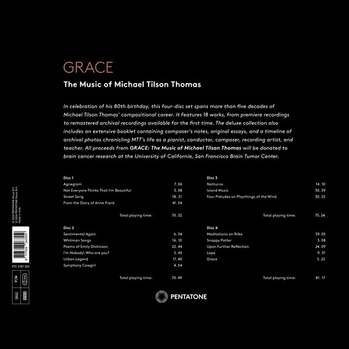 In celebration of his 80th birthday, this four-disc set spans more than five decades of Michael Tilson Thomas' compositional career. It features 18 works, from premiere recordings to remastered archival recordings available for the first time. The deluxe collection also includes an extensive booklet containing composer's notes, original essays, and a timeline of archival photos chronicling MTT's life as a pianist, conductor, composer, recording artist, and teacher. All proceeds from GRACE: The Music of Michael Tilson Thomas will be donated to brain cancer research at the University of California, San Francisco Brain Tumor Center.