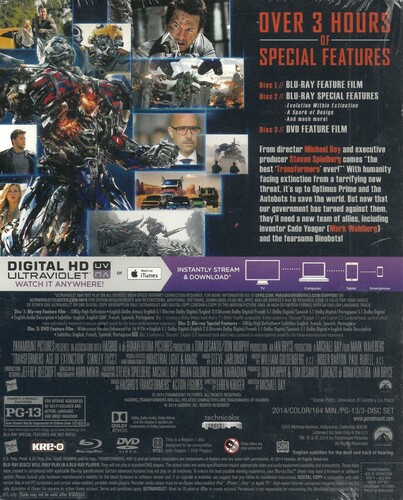 From director Michael Bay and executive producer Steven Spielberg comes the best 'Transformers' ever! With humanity facing extinction from a terrifying new threat, it's up to Optimus Prime and the Autobots to save the world. But now that our government has turned against them, they'll need a new team of allies, including inventor Cade Yeager (Mark Wahlberg) and the fearsome Dinobots!