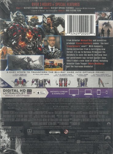 From director Michael Bay and executive producer Steven Spielberg comes the best 'Transformers' ever! With humanity facing extinction from a terrifying new threat, it's up to Optimus Prime and the Autobots to save the world. But now that our government has turned against them, they'll need a new team of allies, including inventor Cade Yeager (Mark Wahlberg) and the fearsome Dinobots!