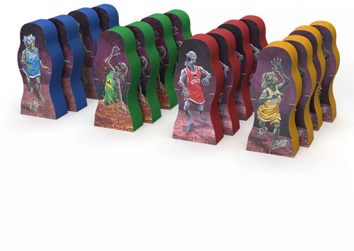 Components: 4 chipboard buildings, 4 obstacles, 4 score dials, 16 Zombie meeples, 40 rubber bands, Rule Book
