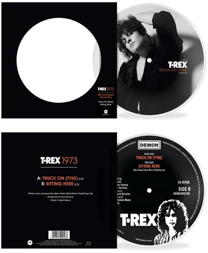 As part of our T. Rex "1973" year campaign, alongside the "Whatever Happened To The Teenage Dream?" 5LP and 4CD box sets, and the "Songwriter: 1973" LP, Demon Records is issuing T. Rex's 1973 singles as highly collectable 7" picture discs, with photos from the Keith Morris archive. • The third release is "Truck On (Tyke)", originally released in November 1973. It peaked in the UK charts at number 12, while the Top Ten featured Wizzard's "I Wish It Could Be Christmas Every Day" and Mott The Hoople's "Roll Away The Stone" and Slade's "Merry Xmas Everybody" was already at Number 1. "Truck On (Tyke)" stayed in the charts for eleven weeks. • Neither "Truck On (Tyke)" or it's B-side "Sitting Here" appeared on the "Zinc Alloy" album, released in early 1974.